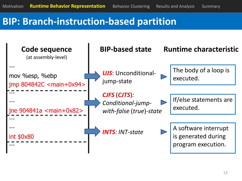 Motivation Runtime Behavior Representation Behavior Clustering Results and Analysis Summary BIP: Branch-instruction-based partition Code sequence (at assembly-level) BIP-based state Runtime characteristic mov %esp, %ebp jmp 804842C <main+0x94> jne 904841a <main+0x82> int $0x80 The body of a loop is executed. UJS: Unconditional-jump-state CJFS(CJTS): Conditional-jump-with-false (true)-state If/else statements are executed. A software interrupt is generated during program execution. INTS: INT-state