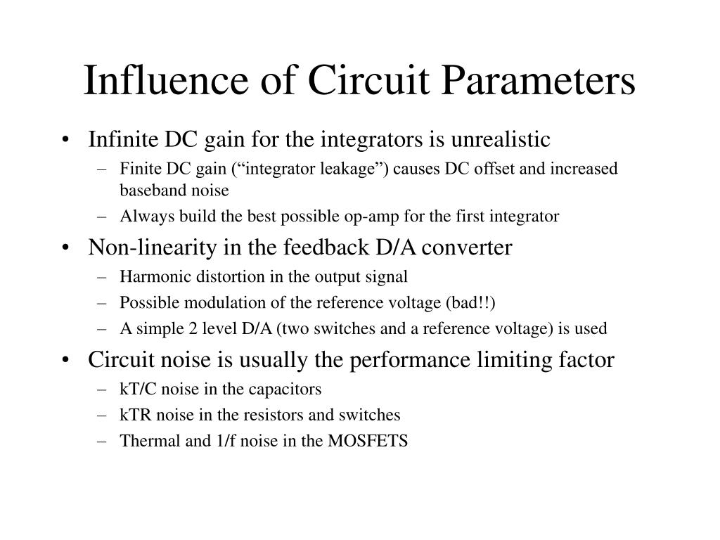 Influence of Circuit Parameters • Infinite DC gain for the integrators is unrealistic • Finite DC gain (“integrator leakage”) causes DC offset and increased baseband noise • Always build the best possible op-amp for the first integrator • Non-linearity in the feedback D/A converter • Harmonic distortion in the output signal • Possible modulation of the reference voltage (bad!!) • A simple 2 level D/A (two switches and a reference voltage) is used • Circuit noise is usually the performance limiting factor • kT/C noise in the capacitors • kTR noise in the resistors and switches • Thermal and 1/f noise in the MOSFETS