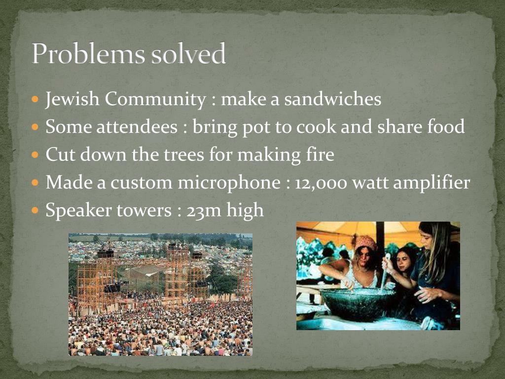 Problems during concerts • Overcrowded : climbing fence and walk without pay • Food and medical supplies ran out • Rain : mud, delaying performances • Drug overdose • 2 babies were born, 3 death • Sound system • Traffic jam