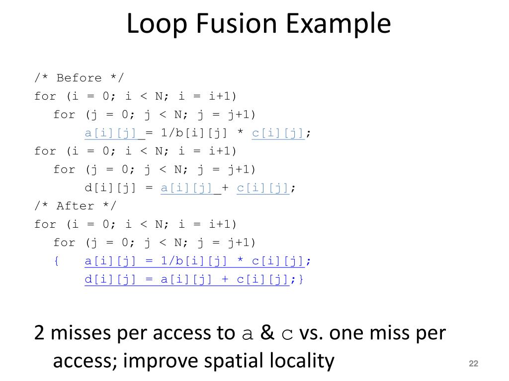 Loop Fusion Example /* Before */ for (i = 0; i < N; i = i+1) for (j = 0; j < N; j = j+1) a[i][j]= 1/b[i][j] * c[i][j]; for (i = 0; i < N; i = i+1) for (j = 0; j < N; j = j+1) d[i][j] = a[i][j]+ c[i][j]; /* After */ for (i = 0; i < N; i = i+1) for (j = 0; j < N; j = j+1) { a[i][j] = 1/b[i][j] * c[i][j]; d[i][j] = a[i][j] + c[i][j];} 2 misses per access to a & c vs. one miss per access; improve spatial locality