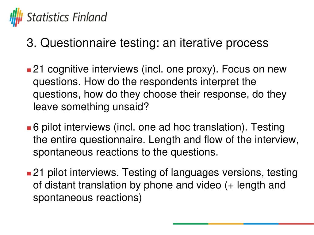 3. Questionnairetesting: an iterativeprocess • 21 cognitive interviews (incl. one proxy). Focus on new questions. How do the respondents interpret the questions, how do they choose their response, do they leave something unsaid? • 6 pilot interviews (incl. one ad hoc translation). Testing the entire questionnaire. Length and flow of the interview, spontaneous reactions to the questions. • 21 pilot interviews. Testing of languages versions, testing of distant translation by phone and video (+ length and spontaneous reactions)