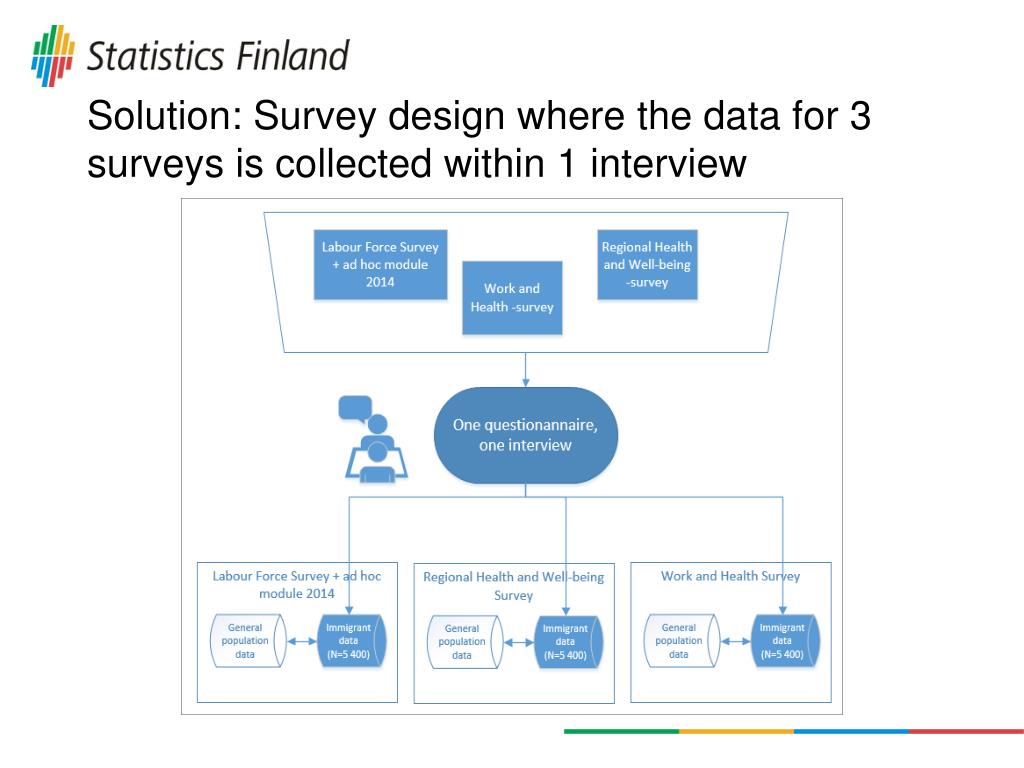 Problem 3: Disaggregating results according to immigrant status is not possible when there are too few immigrants in the general population survey samples • No results: problems go unnoticed. Separate studies: comparison? • EU immigrant integration indicators derive from Labour Force Survey (LFS), Survey on Income and Living Conditions (SILC) and PISA • LFS ad hoc module 2014 on Labour market situation of immigrants and their descendants in the Finnish LFS the number or immigrants would be very low (~900). • Oversampling – expensive • Pooling of data from several years – timeliness and quality problems, not possible for LFS ad hoc module 2014