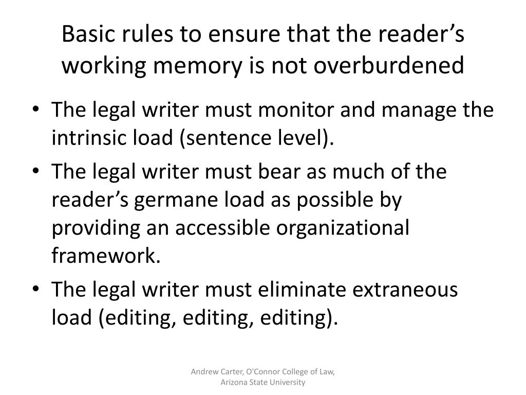 Basic rules to ensure that the reader’s working memory is not overburdened The legal writer must monitor and manage the intrinsic load (sentence level). The legal writer must bear as much of the reader’s germane load as possible by providing an accessible organizational framework. The legal writer must eliminate extraneous load (editing, editing, editing). Andrew Carter, O'Connor College of Law, Arizona State University