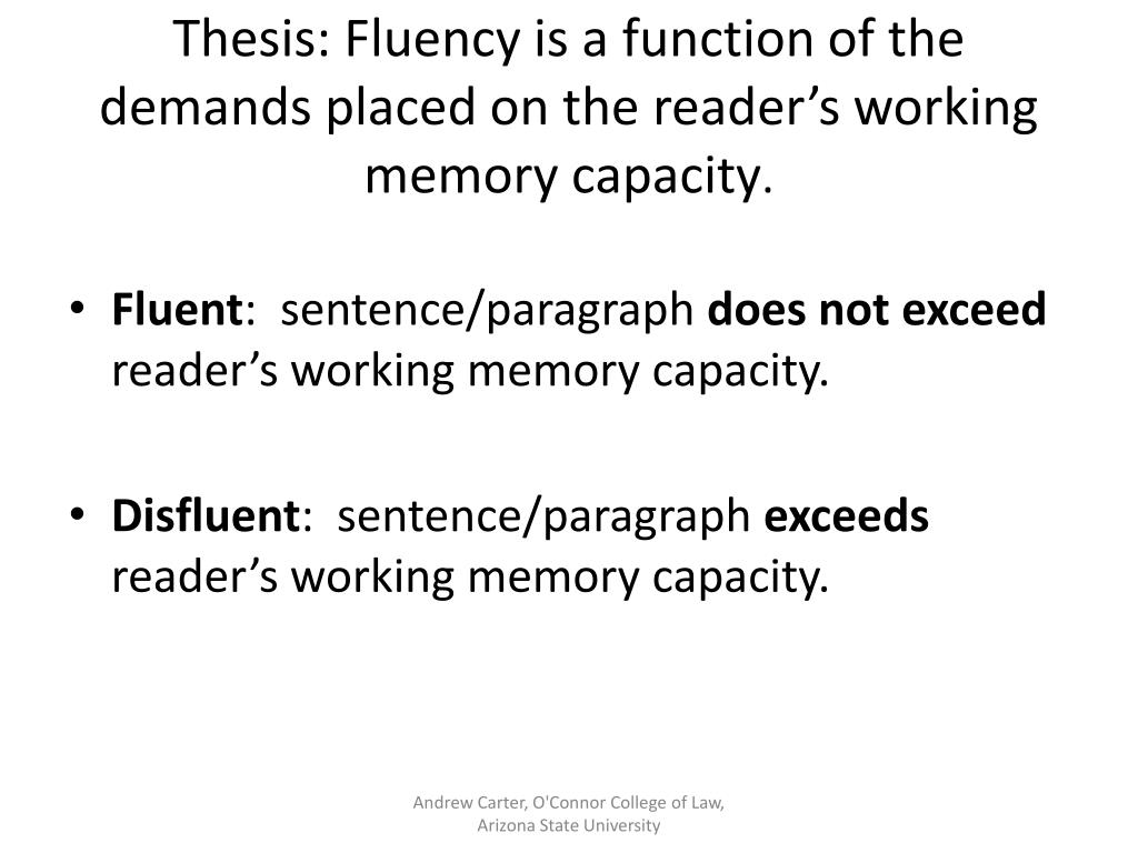 Thesis: Fluency is a function of the demands placed on the reader’s working memory capacity. • Fluent: sentence/paragraph does not exceed reader’s working memory capacity. • Disfluent: sentence/paragraph exceeds reader’s working memory capacity. Andrew Carter, O'Connor College of Law, Arizona State University