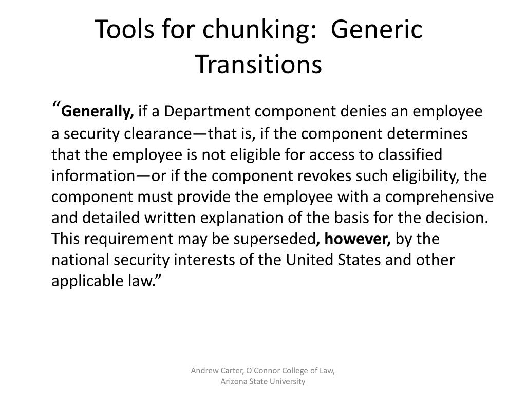 Tools for chunking: Generic Transitions “Generally, if a Department component denies an employee a security clearance—that is, if the component determines that the employee is not eligible for access to classified information—or if the component revokes such eligibility, the component must provide the employee with a comprehensive and detailed written explanation of the basis for the decision. This requirement may be superseded, however, by the national security interests of the United States and other applicable law.” Andrew Carter, O'Connor College of Law, Arizona State University