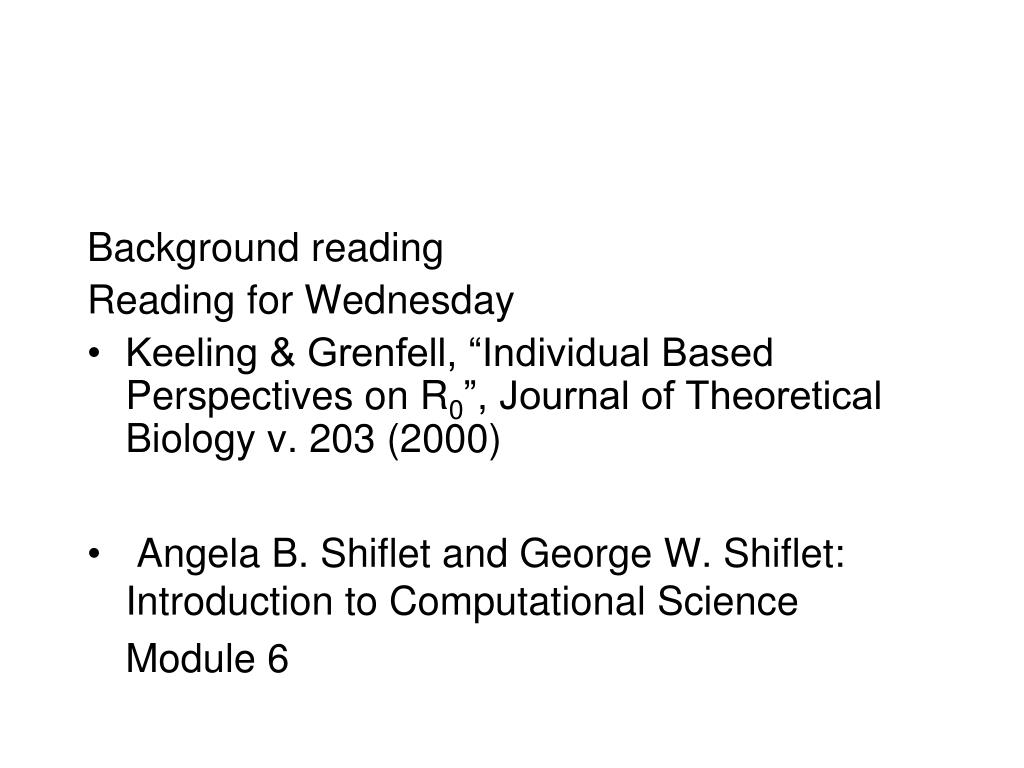 Background reading Reading for Wednesday • Keeling & Grenfell, “Individual Based Perspectives on R0”, Journal of Theoretical Biology v. 203 (2000) • Angela B. Shiflet and George W. Shiflet: Introduction to Computational Science Module 6