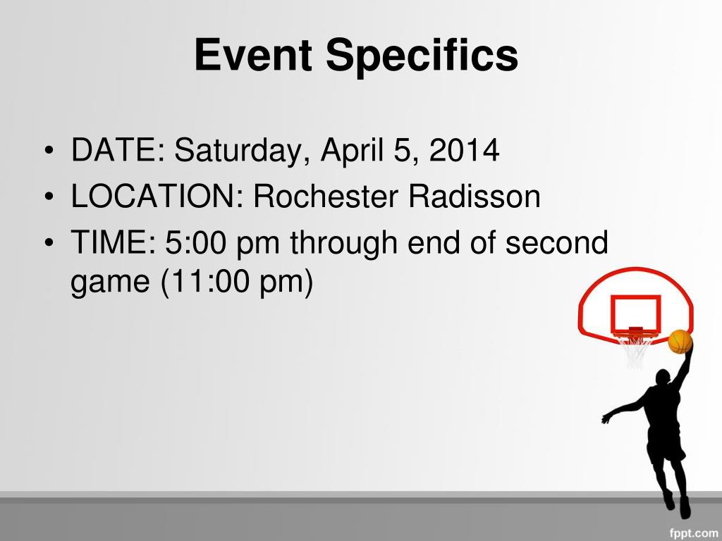Event Specifics • DATE: Saturday, April 5, 2014 • LOCATION: Rochester Radisson • TIME: 5:00 pm through end of second game (11:00 pm)