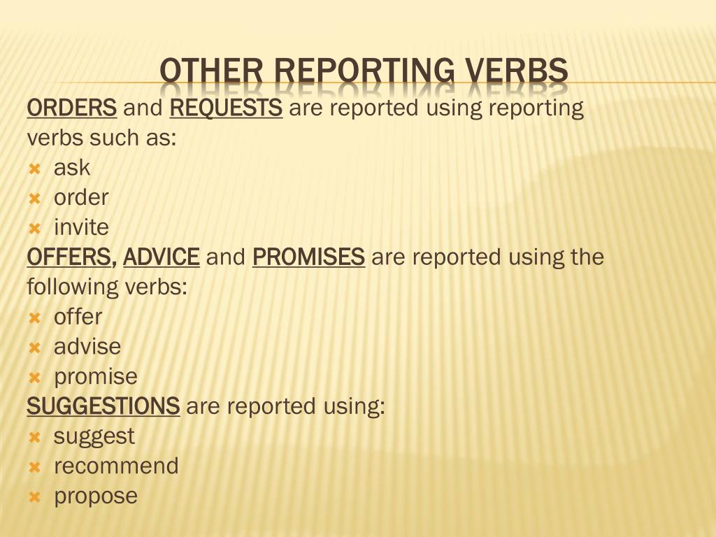 ORDERSandREQUESTS are reportedusingreporting verbssuchas: • ask • order • invite OFFERS, ADVICEandPROMISESare reportedusing the followingverbs: • offer • advise • promise SUGGESTIONS are reportedusing: • suggest • recommend • propose Otherreportingverbs