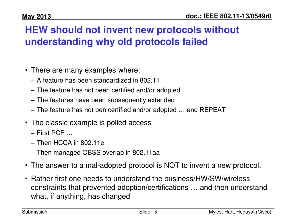 HEW should not invent new protocols without understanding why old protocols failed Myles, Hart, Hedayat (Cisco) • There are many examples where: • A feature has been standardized in 802.11 • The feature has not been certified and/or adopted • The features have been subsequently extended • The feature has not ben certified and/or adopted … and REPEAT • The classic example is polled access • First PCF … • Then HCCA in 802.11e • Then managed OBSS overlap in 802.11aa • The answer to a mal-adopted protocol is NOT to invent a new protocol. • Rather first one needs to understand the business/HW/SW/wireless constraints that prevented adoption/certifications … and then understand what, if anything, has changed