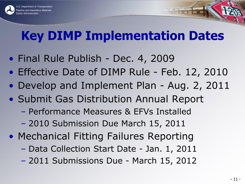 Key DIMP Implementation Dates • Final Rule Publish - Dec. 4, 2009 • Effective Date of DIMP Rule - Feb. 12, 2010 • Develop and Implement Plan - Aug. 2, 2011 • Submit Gas Distribution Annual Report • Performance Measures & EFVs Installed • 2010 Submission Due March 15, 2011 • Mechanical Fitting Failures Reporting • Data Collection Start Date - Jan. 1, 2011 • 2011 Submissions Due - March 15, 2012