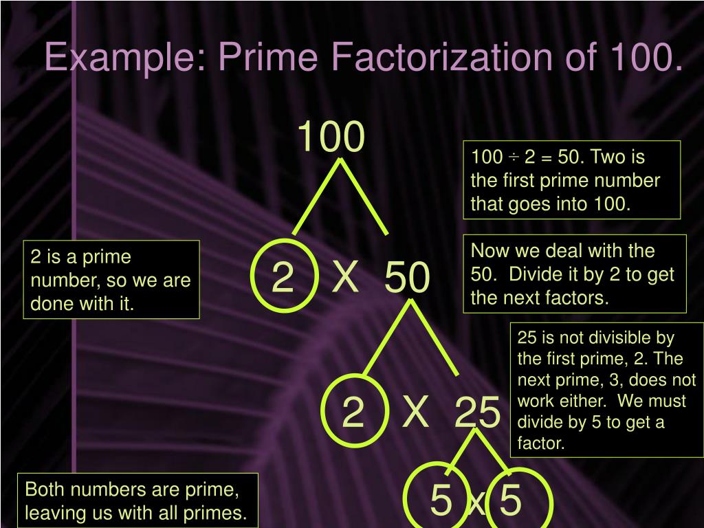 Example: Prime Factorization of 100. 100 100 ÷ 2 = 50. Two is the first prime number that goes into 100. Now we deal with the 50. Divide it by 2 to get the next factors. 2 is a prime number, so we are done with it. 2 X 50 25 is not divisible by the first prime, 2. The next prime, 3, does not work either. We must divide by 5 to get a factor. 2 X 25 5 x 5 Both numbers are prime, leaving us with all primes.