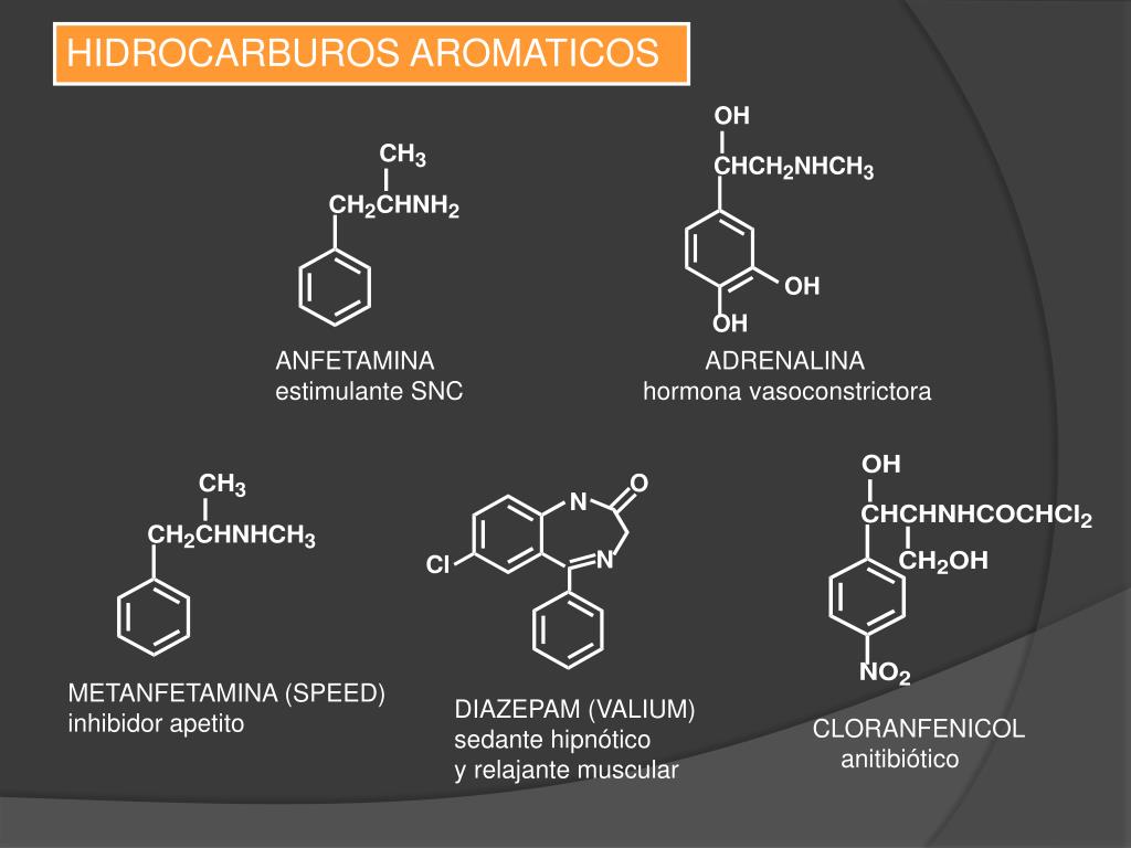 QUIMICA DEL BENCENO. UNIVERSIDAD AUTONOMA SAN FRANCISCO. ANFETAMINA estimulante SNC. ADRENALINA hormona vasoconstrictora. DIAZEPAM (VALIUM) sedante hipnótico y relajante muscular. CLORANFENICOL anitibiótico. METANFETAMINA (SPEED) inhibidor apetito.