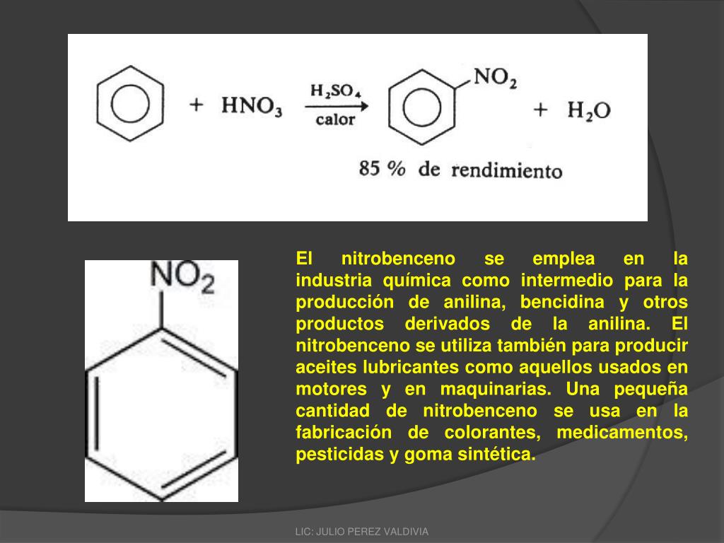 El nitrobenceno se emplea en la industria química como intermedio para la producción de anilina, bencidina y otros productos derivados de la anilina. El nitrobenceno se utiliza también para producir aceites lubricantes como aquellos usados en motores y en maquinarias. Una pequeña cantidad de nitrobenceno se usa en la fabricación de colorantes, medicamentos, pesticidas y goma sintética. LIC: JULIO PEREZ VALDIVIA