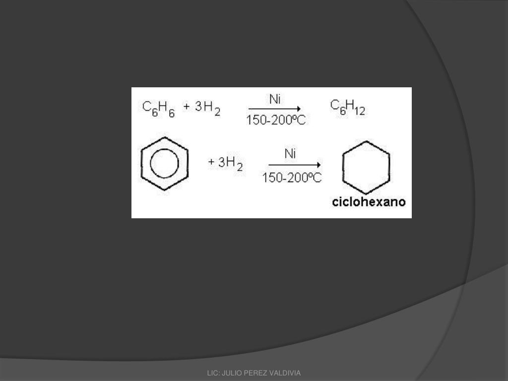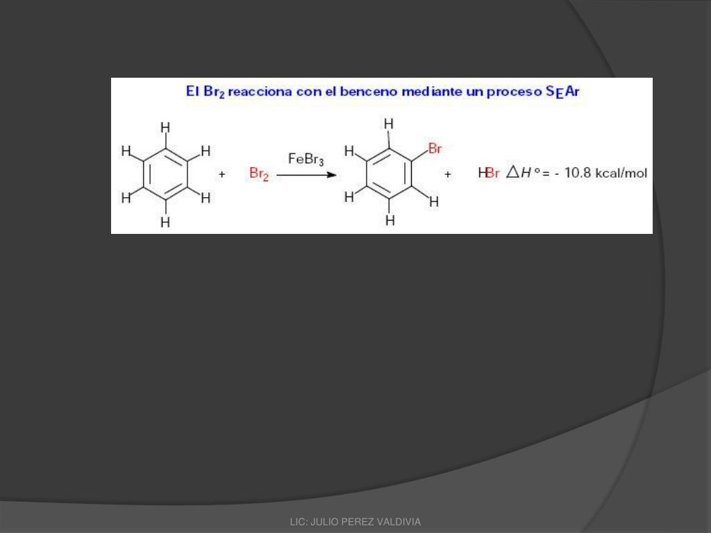 REACCIONES DEL BENCENO • Propiedades Físicas y Químicas: • Es un compuesto particularmente estable, pues puede soportar el calor durante largo tiempo y presión alta manteniendo su identidad estructural. • El benceno no reacciona tan fácilmente con reactivos que típicamente lo hacen con alquenos y alcadienos. • Se tiene que utilizar otro tipo de condiciones y/o catalizadores, como el Bromo en presencia de FeBr3 a temperatura ambiente, donde se da una reacción de sustitución entre el hidrógeno y el bromo. • Las longitudes de enlace carbono – carbono son de 1.39 Å en el benceno y no el típico 1.34 Å del C – C en un doble enlace, y mucho menos el 1.54 Å del enlace sencillo C – C. LIC: JULIO PEREZ VALDIVIA