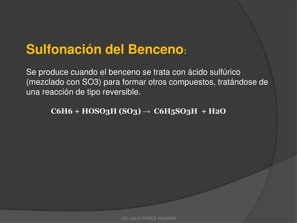 Sulfonación del Benceno: Se produce cuando el benceno se trata con ácido sulfúrico (mezclado con SO3) para formar otros compuestos, tratándose de una reacción de tipo reversible. C6H6 + HOSO3H (SO3) → C6H5SO3H + H2O LIC: JULIO PEREZ VALDIVIA