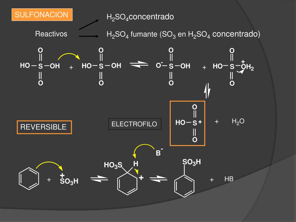SULFONACION H2SO4concentrado H2SO4 fumante (SO3 en H2SO4 concentrado) Reactivos + + + H2O ELECTROFILO REVERSIBLE + + HB