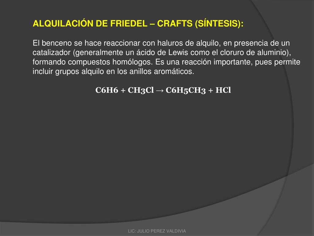 ALQUILACIÓN DE FRIEDEL – CRAFTS (SÍNTESIS): El benceno se hace reaccionar con haluros de alquilo, en presencia de un catalizador (generalmente un ácido de Lewis como el cloruro de aluminio), formando compuestos homólogos. Es una reacción importante, pues permite incluir grupos alquilo en los anillos aromáticos. C6H6 + CH3Cl → C6H5CH3 + HCl LIC: JULIO PEREZ VALDIVIA