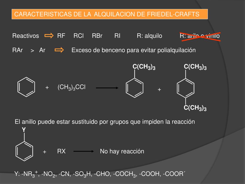 CARACTERISTICAS DE LA ALQUILACION DE FRIEDEL-CRAFTS Reactivos RF RCl RBr RI R: alquilo R: arilo o vinilo RAr > Exceso de benceno para evitar polialquilación Ar + (CH3)3CCl + El anillo puede estar sustituido por grupos que impiden la reacción + RX No hay reacción Y: -NR3+, -NO2, -CN, -SO3H, -CHO, -COCH3, -COOH, -COOR´