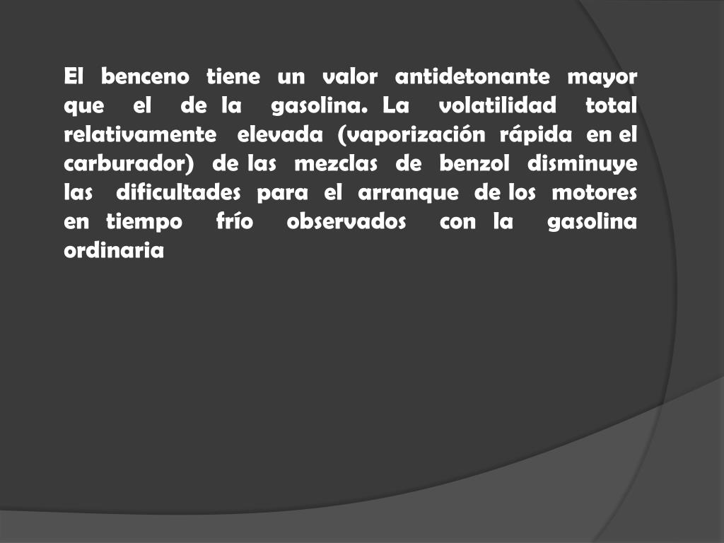 El benceno tiene un valor antidetonante mayor que el de la gasolina. La volatilidad total relativamente elevada (vaporización rápida en el carburador) de las mezclas de benzol disminuye las dificultades para el arranque de los motores en tiempo frío observados con la gasolina ordinaria