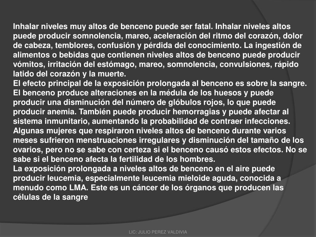 Inhalar niveles muy altos de benceno puede ser fatal. Inhalar niveles altos puede producir somnolencia, mareo, aceleración del ritmo del corazón, dolor de cabeza, temblores, confusión y pérdida del conocimiento. La ingestión de alimentos o bebidas que contienen niveles altos de benceno puede producir vómitos, irritación del estómago, mareo, somnolencia, convulsiones, rápido latido del corazón y la muerte. El efecto principal de la exposición prolongada al benceno es sobre la sangre. El benceno produce alteraciones en la médula de los huesos y puede producir una disminución del número de glóbulos rojos, lo que puede producir anemia. También puede producir hemorragias y puede afectar al sistema inmunitario, aumentando la probabilidad de contraer infecciones. Algunas mujeres que respiraron niveles altos de benceno durante varios meses sufrieron menstruaciones irregulares y disminución del tamaño de los ovarios, pero no se sabe con certeza si el benceno causó estos efectos. No se sabe si el benceno afecta la fertilidad de los hombres. La exposición prolongada a niveles altos de benceno en el aire puede producir leucemia, especialmente leucemia mieloide aguda, conocida a menudo como LMA. Este es un cáncer de los órganos que producen las células de la sangre LIC: JULIO PEREZ VALDIVIA