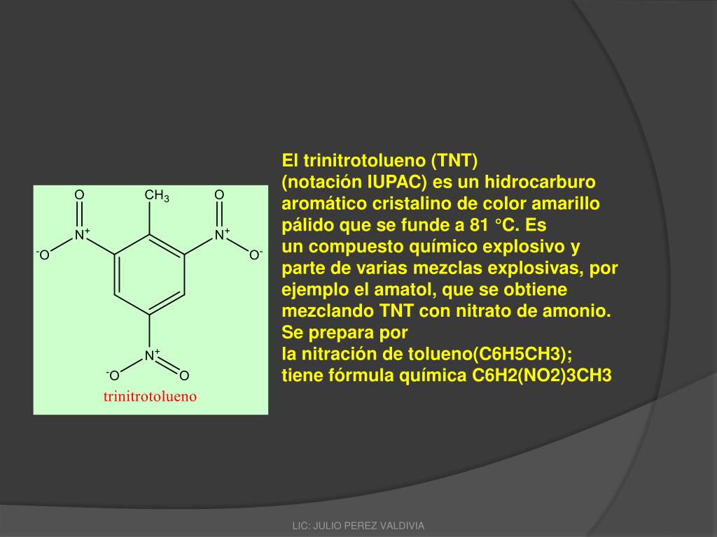 El trinitrotolueno (TNT) (notación IUPAC) es un hidrocarburo aromático cristalino de color amarillo pálido que se funde a 81 °C. Es un compuesto químico explosivo y parte de varias mezclas explosivas, por ejemplo el amatol, que se obtiene mezclando TNT con nitrato de amonio. Se prepara por la nitración de tolueno(C6H5CH3); tiene fórmula química C6H2(NO2)3CH3 LIC: JULIO PEREZ VALDIVIA