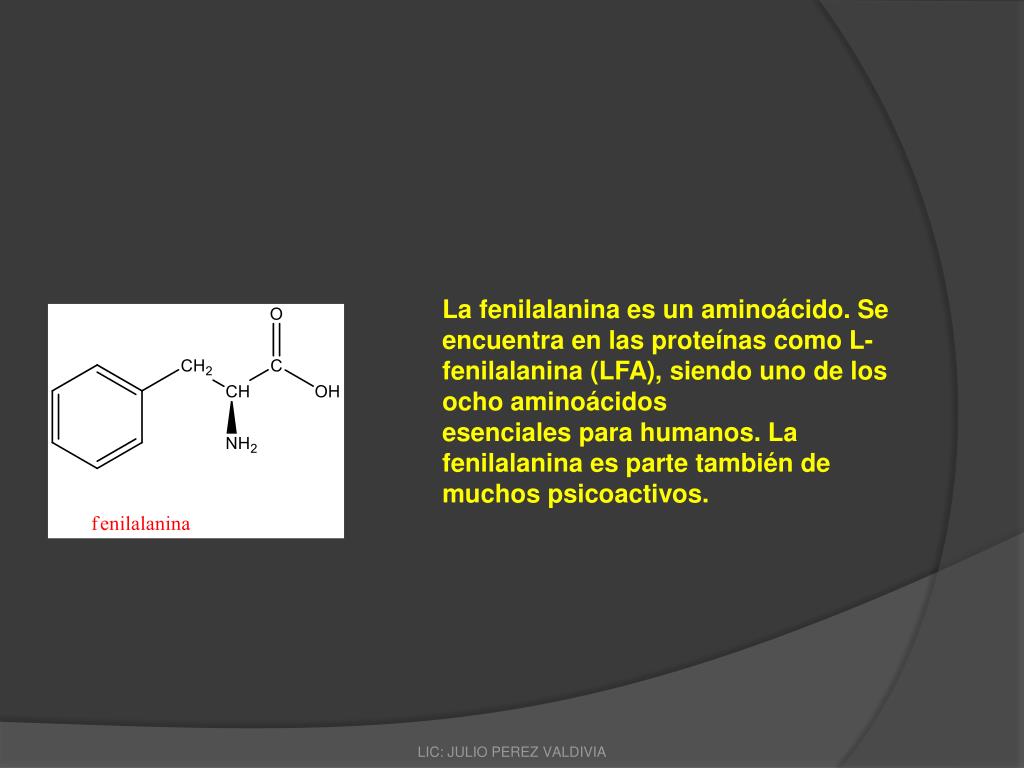 La fenilalanina es un aminoácido. Se encuentra en las proteínas como L-fenilalanina (LFA), siendo uno de los ocho aminoácidos esenciales para humanos. La fenilalanina es parte también de muchos psicoactivos. LIC: JULIO PEREZ VALDIVIA