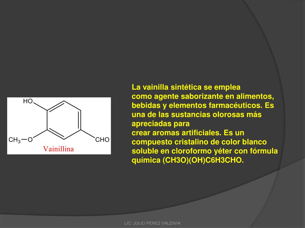 La vainilla sintética se emplea como agente saborizante en alimentos, bebidas y elementos farmacéuticos. Es una de las sustancias olorosas más apreciadas para crear aromas artificiales. Es un compuesto cristalino de color blanco soluble en cloroformo yéter con fórmula química (CH3O)(OH)C6H3CHO. LIC: JULIO PEREZ VALDIVIA