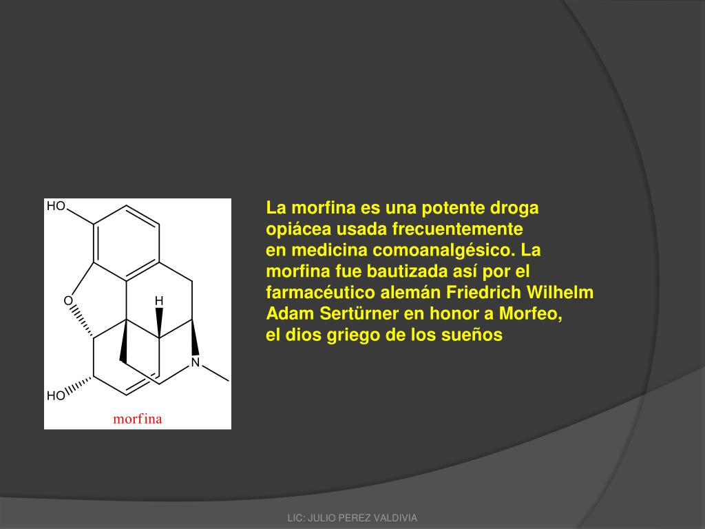 La morfina es una potente droga opiácea usada frecuentemente en medicina comoanalgésico. La morfina fue bautizada así por el farmacéutico alemán FriedrichWilhelm Adam Sertürner en honor a Morfeo, el dios griego de los sueños LIC: JULIO PEREZ VALDIVIA