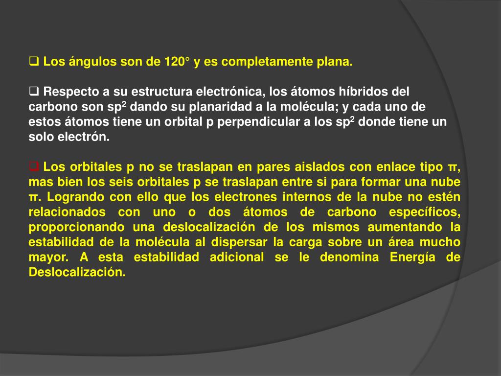 Los ángulos son de 120° y es completamente plana. • Respecto a su estructura electrónica, los átomos híbridos del carbono son sp2 dando su planaridad a la molécula; y cada uno de estos átomos tiene un orbital p perpendicular a los sp2 donde tiene un solo electrón. • Los orbitales p no se traslapan en pares aislados con enlace tipo π, mas bien los seis orbitales p se traslapan entre si para formar una nube π. Logrando con ello que los electrones internos de la nube no estén relacionados con uno o dos átomos de carbono específicos, proporcionando una deslocalización de los mismos aumentando la estabilidad de la molécula al dispersar la carga sobre un área mucho mayor. A esta estabilidad adicional se le denomina Energía de Deslocalización.
