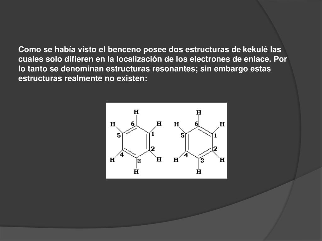 Como se había visto el benceno posee dos estructuras de kekulé las cuales solo difieren en la localización de los electrones de enlace. Por lo tanto se denominan estructuras resonantes; sin embargo estas estructuras realmente no existen: