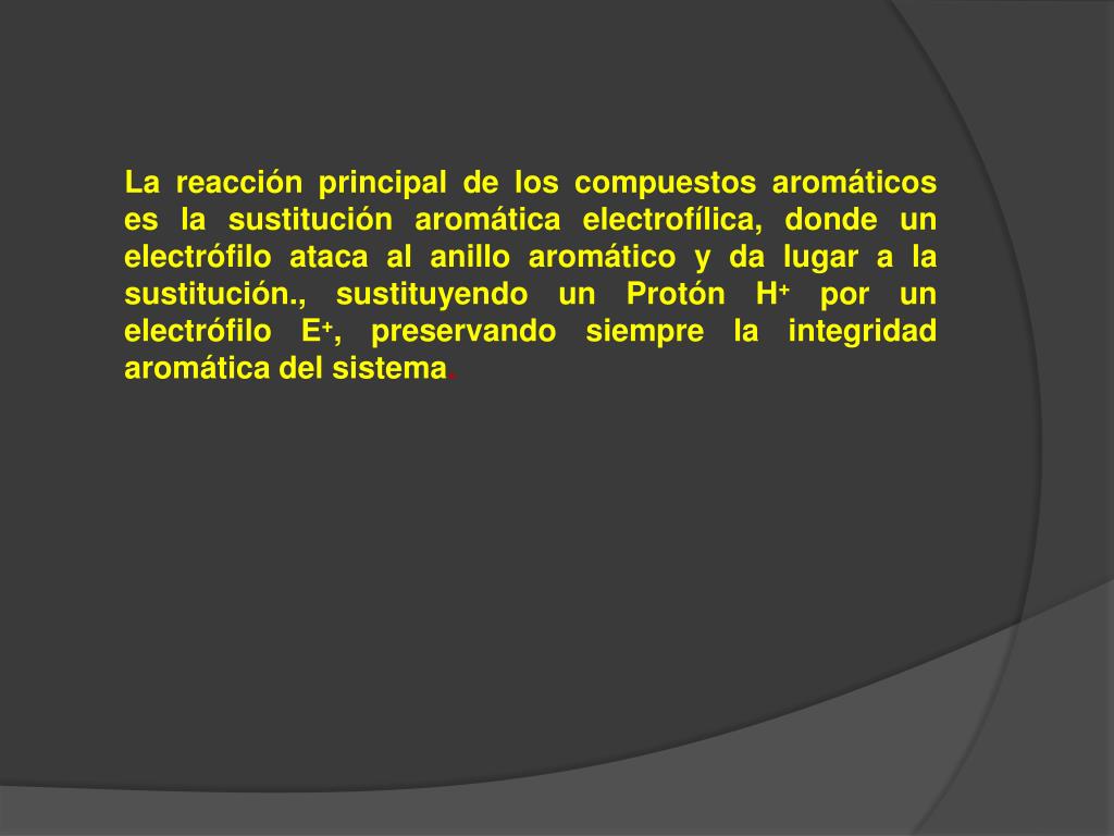 La reacción principal de los compuestos aromáticos es la sustitución aromática electrofílica, donde un electrófilo ataca al anillo aromático y da lugar a la sustitución., sustituyendo un Protón H+ por un electrófilo E+, preservando siempre la integridad aromática del sistema.