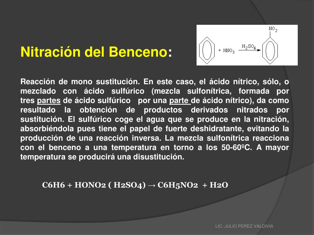 Nitración del Benceno: Reacción de mono sustitución. En este caso, el ácido nítrico, sólo, o mezclado con ácido sulfúrico (mezcla sulfonítrica, formada por tres partes de ácido sulfúrico por una parte de ácido nítrico), da como resultado la obtención de productos derivados nitrados por sustitución. El sulfúrico coge el agua que se produce en la nitración, absorbiéndola pues tiene el papel de fuerte deshidratante, evitando la producción de una reacción inversa. La mezcla sulfonítrica reacciona con el benceno a una temperatura en torno a los 50-60ºC. A mayor temperatura se producirá una disustitución. C6H6 + HONO2 ( H2SO4) → C6H5NO2 + H2O LIC: JULIO PEREZ VALDIVIA