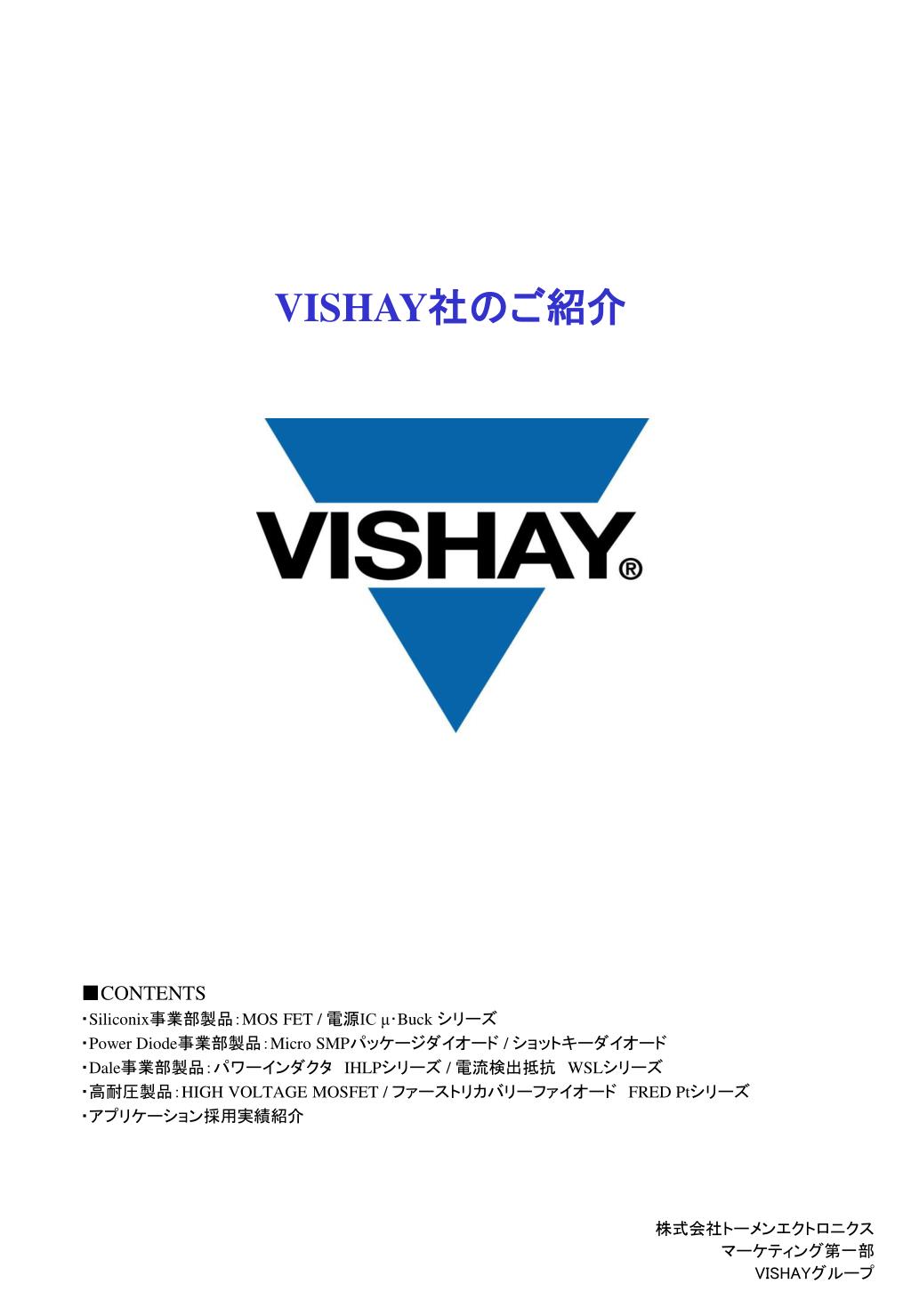 VISHAY社のご紹介 ■CONTENTS ・Siliconix事業部製品:MOS FET / 電源IC μ・Buck シリーズ ・Power Diode事業部製品:Micro SMPパッケージダイオード / ショットキーダイオード ・Dale事業部製品:パワーインダクタ IHLPシリーズ / 電流検出抵抗 WSLシリーズ ・高耐圧製品:HIGH VOLTAGE MOSFET / ファーストリカバリーファイオード FRED Ptシリーズ ・アプリケーション採用実績紹介 株式会社トーメンエクトロニクス マーケティング第一部 VISHAYグループ