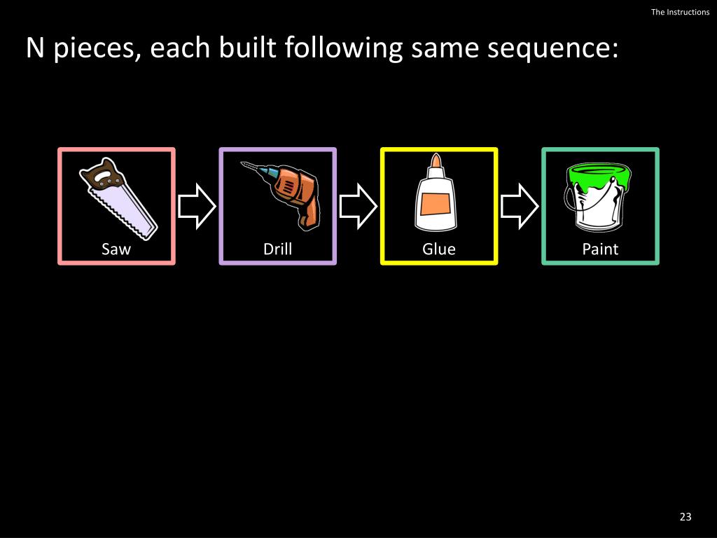 The Instructions • N pieces, each built following same sequence: Saw Drill Glue Paint
