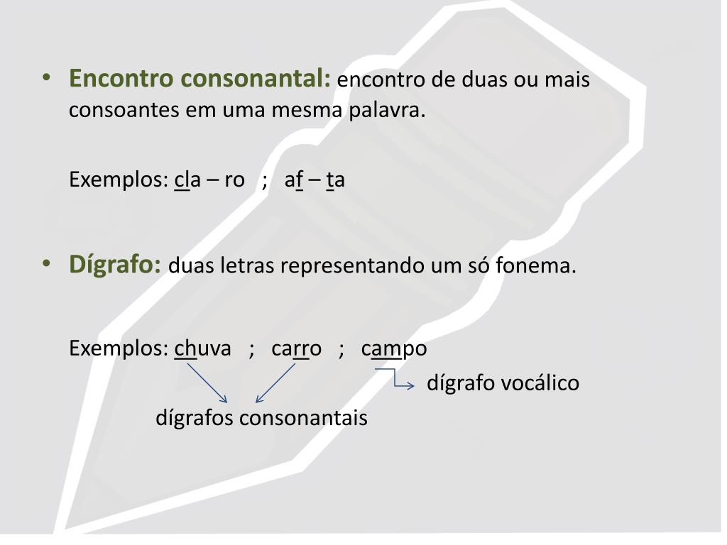 Encontro consonantal:encontro de duas ou mais consoantes em uma mesma palavra. Exemplos: cla – ro ; af – ta • Dígrafo: duas letras representando um só fonema. Exemplos: chuva ; carro ; campo dígrafo vocálico dígrafos consonantais