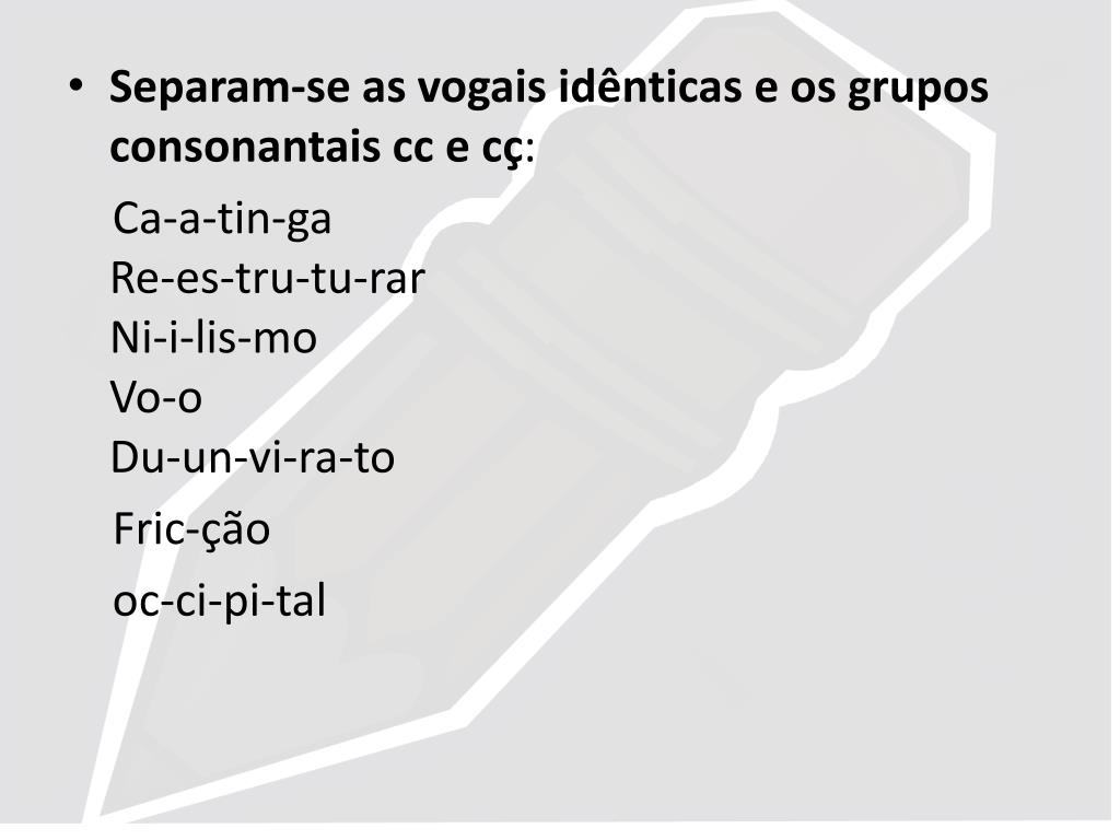 Separam-se as vogais idênticas e os grupos consonantais cc e cç: Ca-a-tin-gaRe-es-tru-tu-rarNi-i-lis-moVo-oDu-un-vi-ra-to Fric-ção oc-ci-pi-tal
