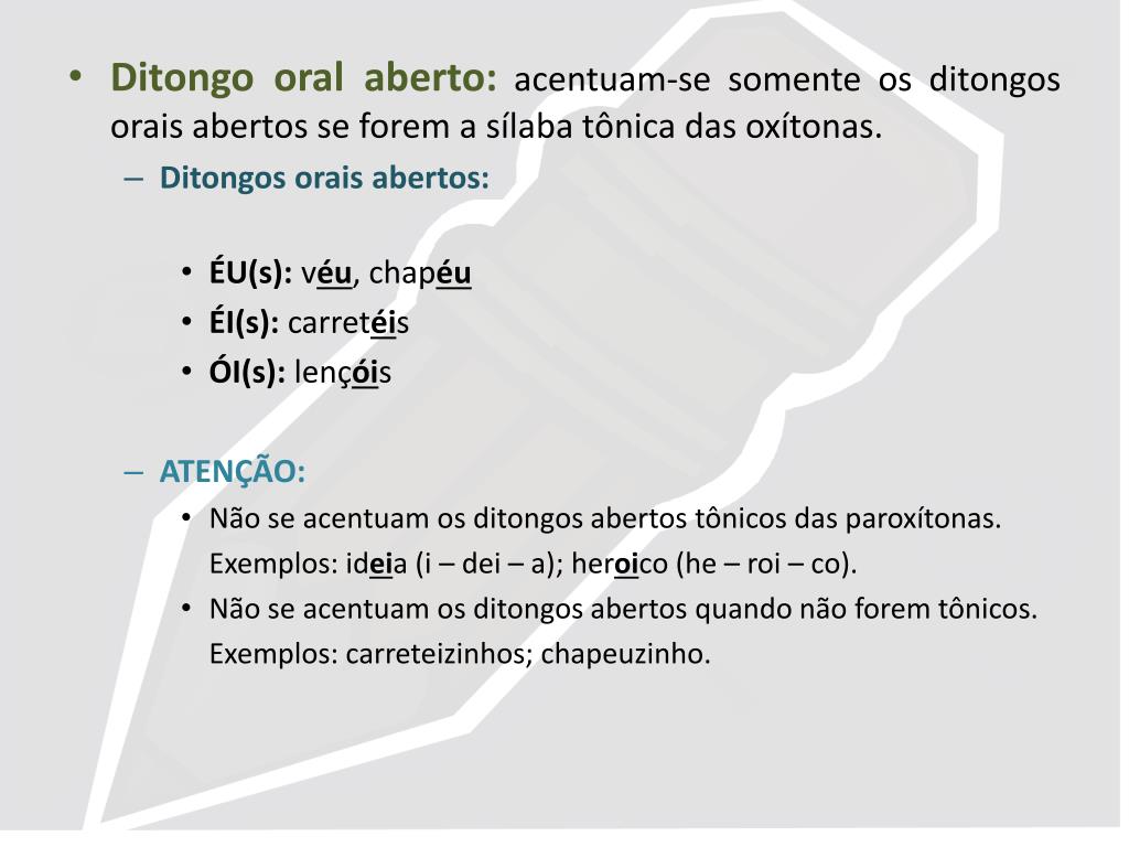 Ditongo oral aberto:acentuam-se somente os ditongos orais abertos se forem a sílaba tônica das oxítonas. • Ditongos orais abertos: • ÉU(s): véu, chapéu • ÉI(s): carretéis • ÓI(s): lençóis • ATENÇÃO: • Não se acentuam os ditongos abertos tônicos das paroxítonas. Exemplos: ideia (i – dei – a); heroico (he – roi – co). • Não se acentuam os ditongos abertos quando não forem tônicos. Exemplos: carreteizinhos; chapeuzinho.