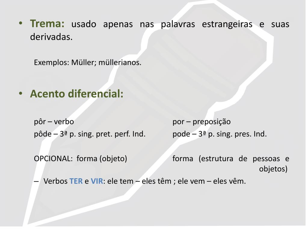 Trema:usado apenas nas palavras estrangeiras e suas derivadas. Exemplos: Müller; müllerianos. • Acento diferencial: pôr – verbo por – preposição pôde – 3ª p. sing. pret. perf. Ind. pode – 3ª p. sing. pres. Ind. OPCIONAL: forma (objeto) forma (estrutura de pessoas e objetos) • Verbos TER e VIR: ele tem – eles têm ; ele vem – eles vêm.