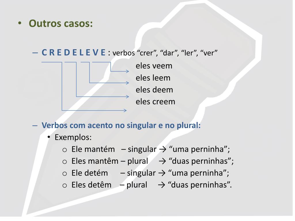 Outros casos: • C R E D E L E V E : verbos “crer”, “dar”, “ler”, “ver” eles veem eles leem eles deem eles creem • Verbos com acento no singular e no plural: • Exemplos: • Ele mantém – singular → “uma perninha”; • Eles mantêm – plural → “duas perninhas”; • Ele detém – singular → “uma perninha”; • Eles detêm – plural → “duas perninhas”.