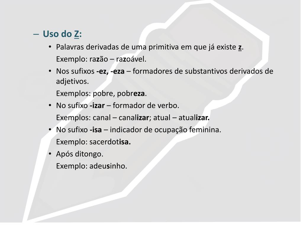 Uso do Z: • Palavras derivadas de uma primitiva em que já existe z. Exemplo: razão – razoável. • Nos sufixos -ez, -eza – formadores de substantivos derivados de adjetivos. Exemplos: pobre, pobreza. • No sufixo -izar – formador de verbo. Exemplos: canal – canalizar; atual – atualizar. • No sufixo -isa– indicador de ocupação feminina. Exemplo: sacerdotisa. • Após ditongo. Exemplo: adeusinho.