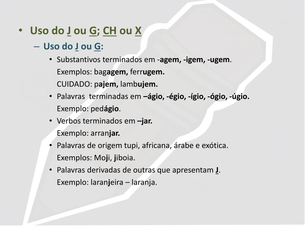 Uso do J ou G; CH ou X • Uso do J ou G: • Substantivos terminados em -agem, -igem, -ugem. Exemplos: bagagem, ferrugem. CUIDADO: pajem, lambujem. • Palavras terminadas em –ágio, -égio, -ígio, -ógio, -úgio. Exemplo: pedágio. • Verbos terminados em –jar. Exemplo: arranjar. • Palavras de origem tupi, africana, árabe e exótica. Exemplos: Moji, jiboia. • Palavras derivadas de outras que apresentam J. Exemplo: laranjeira – laranja.