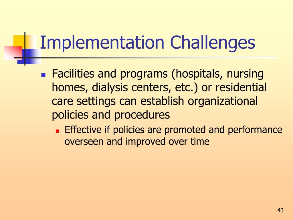 Implementation Challenges • Facilities and programs (hospitals, nursing homes, dialysis centers, etc.) or residential care settings can establish organizational policies and procedures • Effective if policies are promoted and performance overseen and improved over time