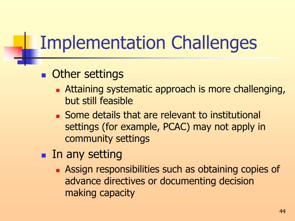 Implementation Challenges • Other settings • Attaining systematic approach is more challenging, but still feasible • Some details that are relevant to institutional settings (for example, PCAC) may not apply in community settings • In any setting • Assign responsibilities such as obtaining copies of advance directives or documenting decision making capacity