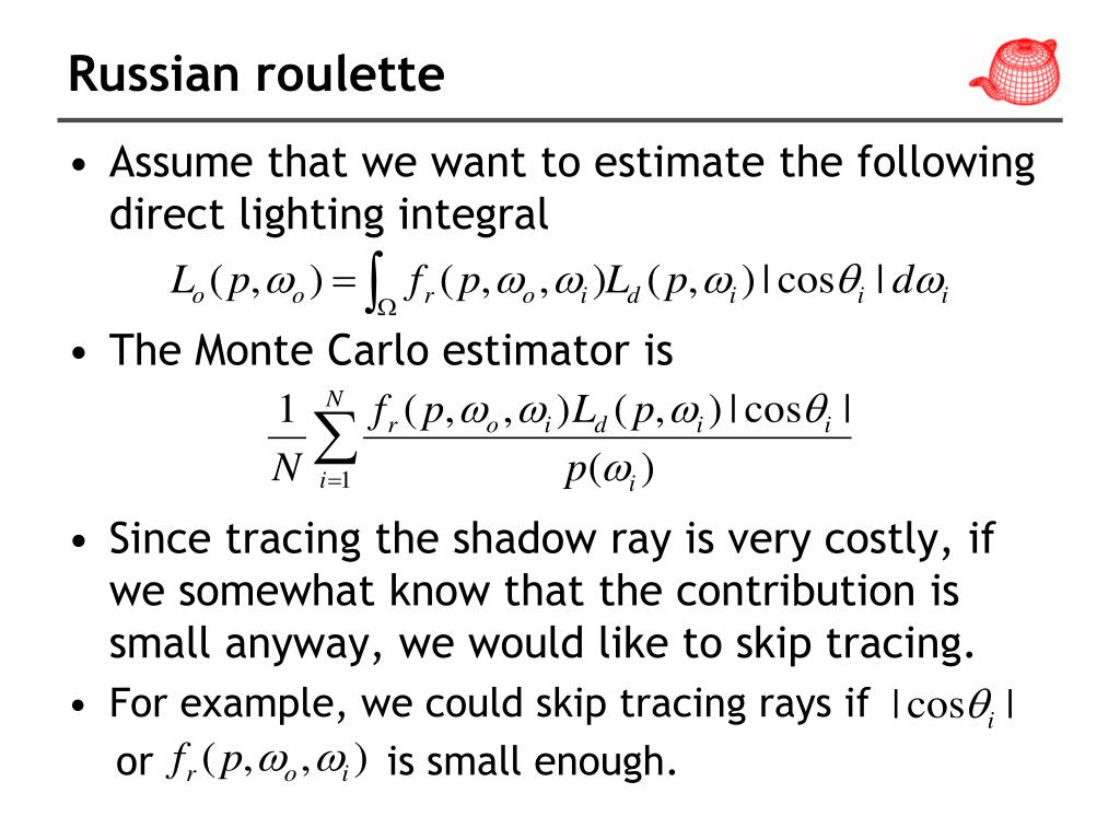 Russian roulette • Assume that we want to estimate the following direct lighting integral • The Monte Carlo estimator is • Since tracing the shadow ray is very costly, if we somewhat know that the contribution is small anyway, we would like to skip tracing. • For example, we could skip tracing rays if or is small enough.
