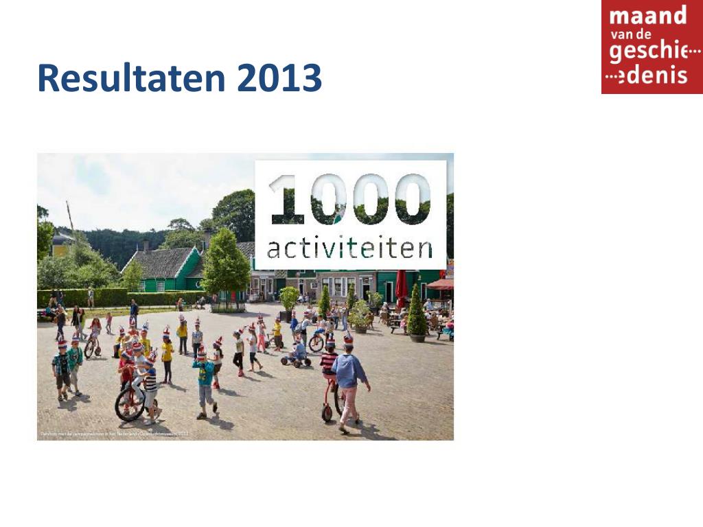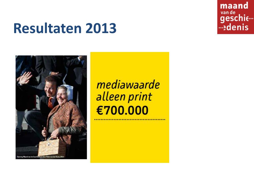 Promotiecampagne • Website met activiteiten, nieuws en verdieping • Programmamagazine i.s.m. Historisch Nieuwsblad (oplage 200.000) • Promotiemateriaal instellingen (banier, poster, magazines, ansichtkaarten) • Promotiemateriaal bibliotheken (display, Maand van de Geschiedenisboek, magazines, posters boekentips) • Promotiefilmpjes • Online quiz • Social media (Twitter en Facebook)