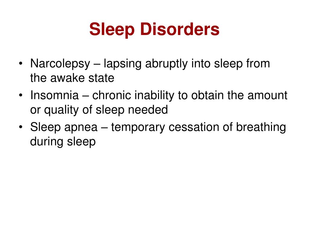 Sleep Disorders • Narcolepsy – lapsing abruptly into sleep from the awake state • Insomnia – chronic inability to obtain the amount or quality of sleep needed • Sleep apnea – temporary cessation of breathing during sleep