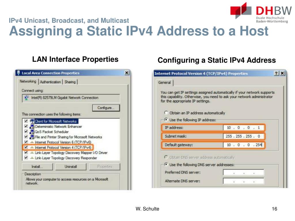 W. Schulte IPv4 Unicast, Broadcast, and MulticastAssigning a Static IPv4 Address to a Host LAN Interface Properties Configuring a Static IPv4 Address