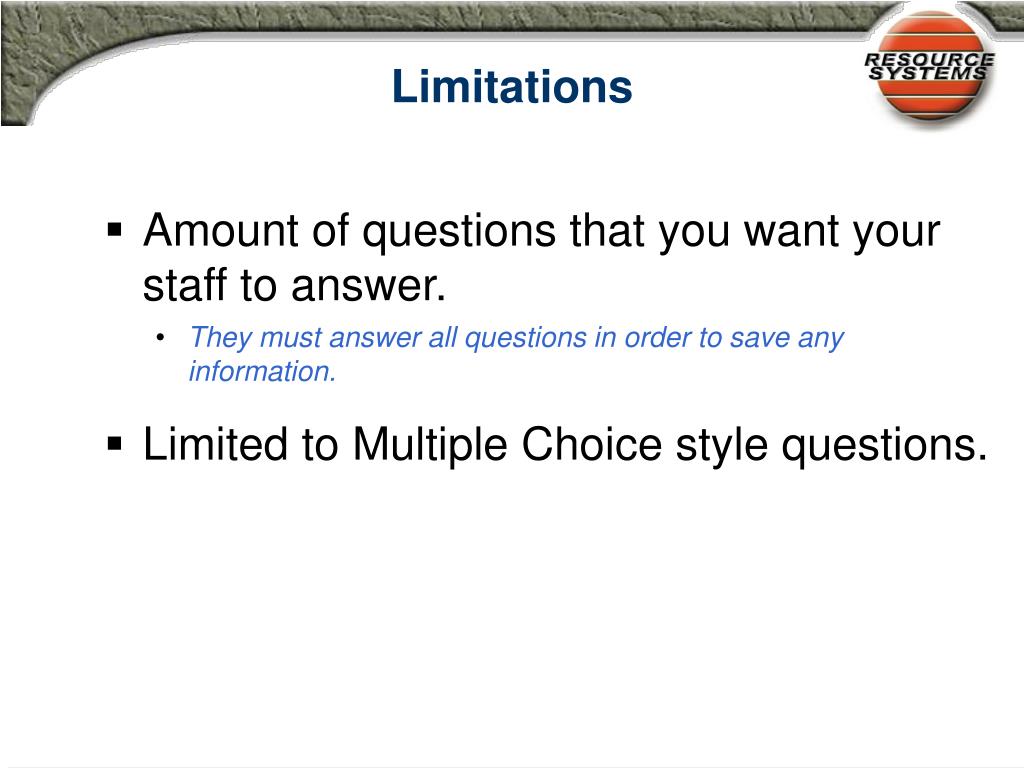 Limitations • Amount of questions that you want your staff to answer. • They must answer all questions in order to save any information. • Limited to Multiple Choice style questions.
