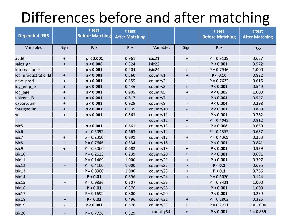 MATCHING • Potential Endogeneity issues: • Selection Bias: Best performing companies use IFRS. They already have less financial constraints => Potential Solutions: Difference in Difference, Regression discontinuity design and Matching • Since we have a cross section we will use propensity score matching approach.