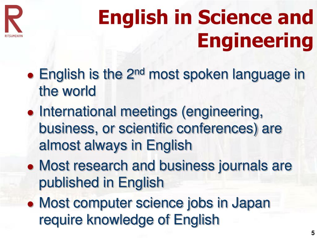 English in Science and Engineering • English is the 2nd most spoken language in the world • International meetings (engineering, business, or scientific conferences) are almost always in English • Most research and business journals are published in English • Most computer science jobs in Japan require knowledge of English